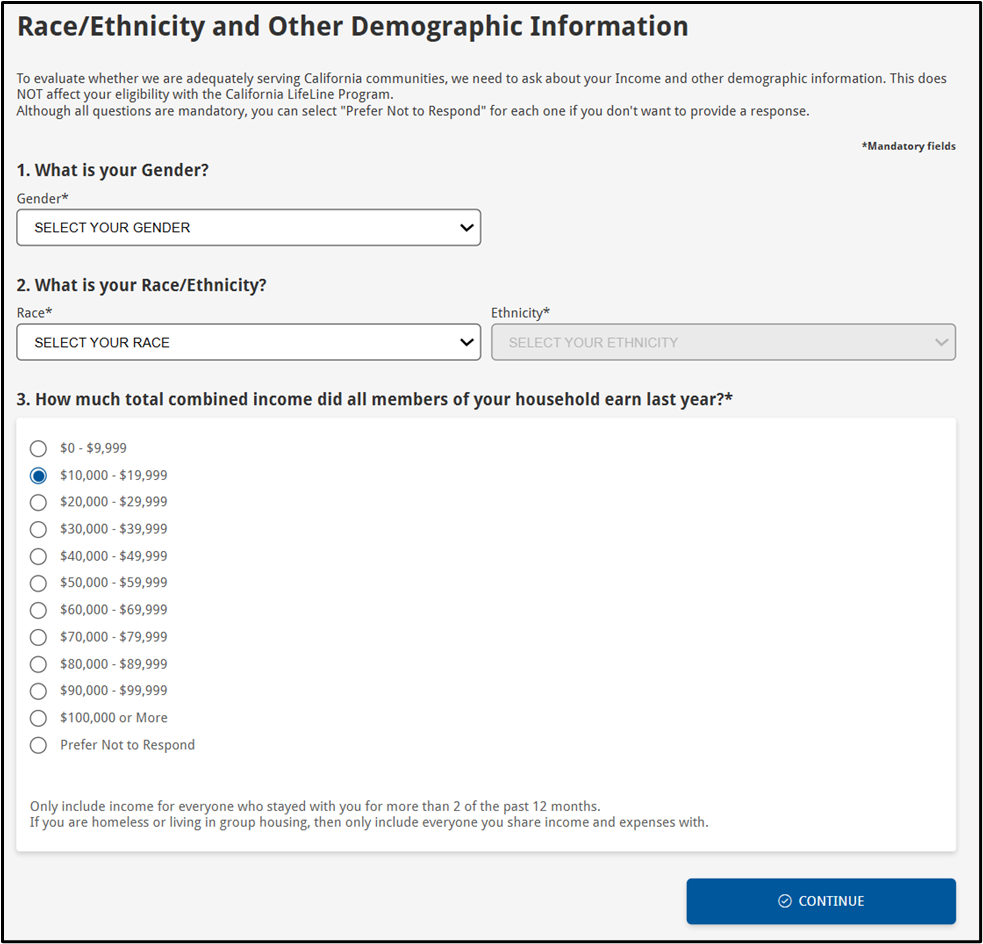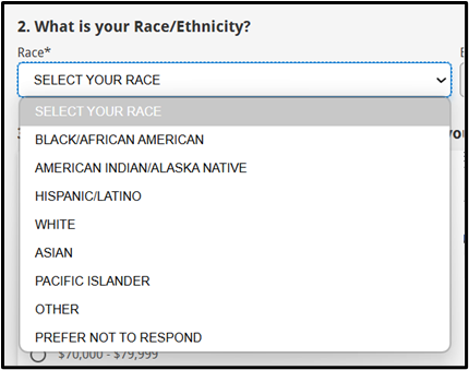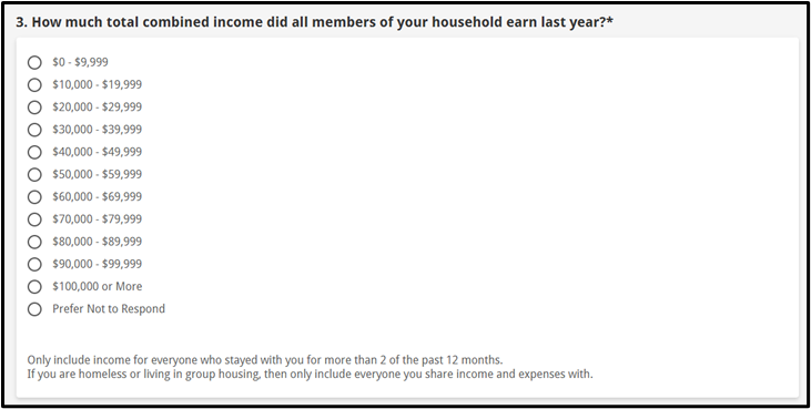 As the image above shows, the following questionnaire will help to gather income and demographic information, which will not affect the user’s eligibility. Applicants can also select the “Prefer Not to Respond” option if they do not want to provide a specific answer.