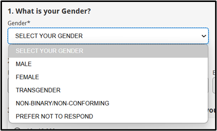 For the first question (What is your Gender?), applicants will be able to select among the following options: Male, Female, Transgender, Non-Binary/Non-Conforming, Prefer Not to Respond.