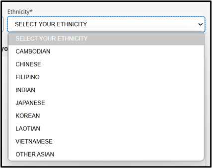 In the second step, applicants will be asked about their race and ethnicity. As shown below, once the Race is selected, the Ethnicity dropdown will become available to select one option from the ones available.