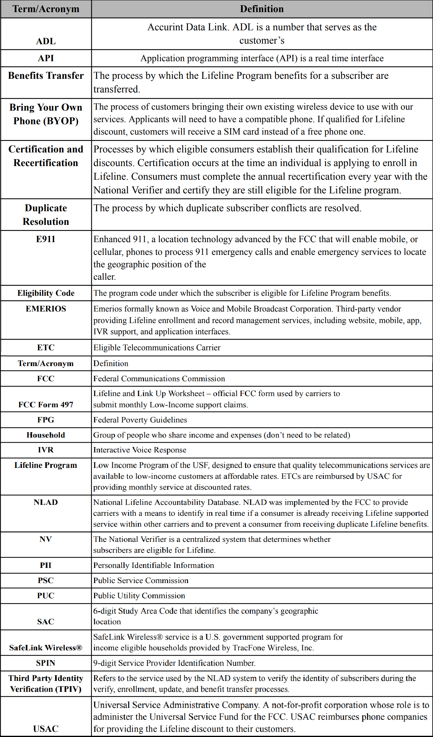Emerios is a third-party vendor that handles the enrollment application process on behalf of TracFone. This vendor is in charge of maintaining interfaces to communicate with TracFone systems, NLAD, and National Verifier systems. Emerios is also responsible for conducting TracFone’s Lifeline Compliance Trainings for its Enrollment Representatives as well as internal TracFone employees.