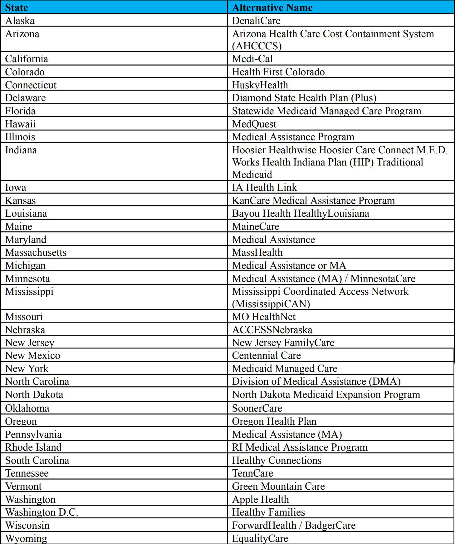 - Medicaid programs are administered by each state and may be offered under a variety of alternative names. See Attachment D for a list of Medicaid program names by state.