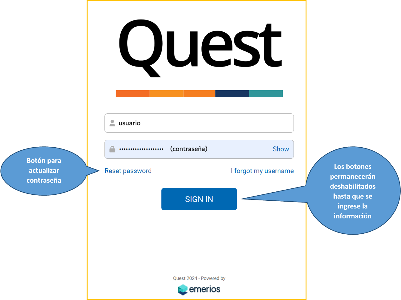 Para iniciar sesión en la Quest App, ingresa el Nombre de usuario y la Contraseña creados durante el proceso de enrolamiento. Primero, será necesario introducir las credenciales: