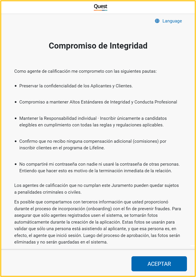 Después de iniciar sesión, la Quest App mostrará el Compromiso de Integridad.