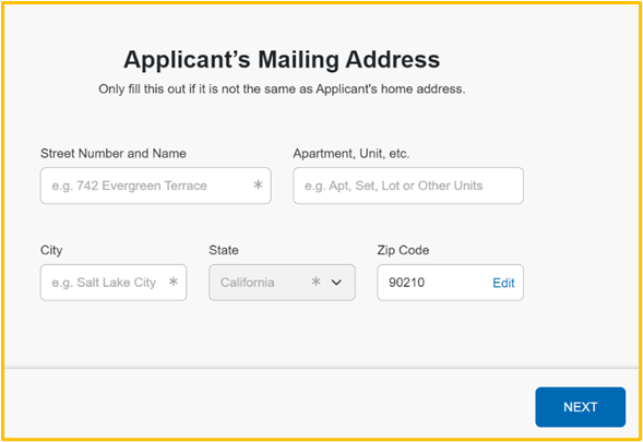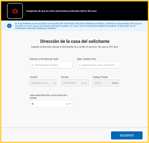 Si el aplicante necesita ingresar una dirección de envío diferente de la dirección principal, puede agregarla en este paso, siempre y cuando la dirección esté en el mismo estado donde reside el aplicante. Las direcciones de envío pueden ser de un familiar, amigo, entrega general o un apartado postal, siempre que sean válidas. Para ingresar la dirección de envío, se debe seleccionar "No" en el menú Usar esta dirección como dirección de postal ubicado debajo de la dirección física.