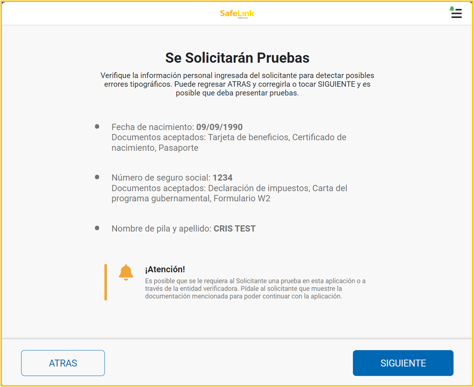 En algunos casos, si la Quest app detecta que hay uno o más problemas de validación, los Agentes de ST tendrán la oportunidad de revisar la información ingresada para asegurarse de que la información personal (PII) sea correcta.