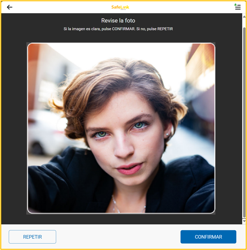 Después de ingresar la información, se solicitará tomar una foto del aplicante para fines de auditoría. Si la foto es clara y legible, se debe presionar el botón CONFIRMAR; de lo contrario, presiona el botón REPETIR para tomar una nueva foto