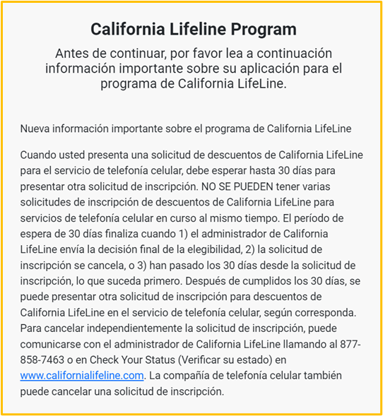 Para el estado de California, se mostrará un aviso sobre el programa, los plazos para aplicar y algunos puntos a tener en cuenta al momento de presentar la solicitud.