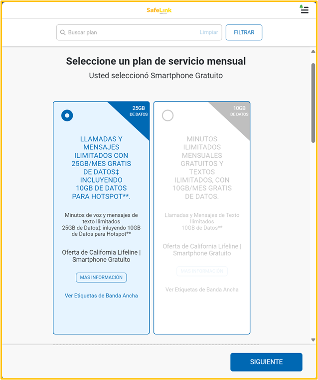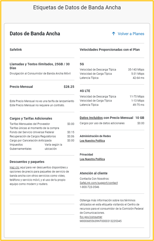 Según lo solicitado por la FCC, al llegar al paso de selección del Plan durante el proceso de enrolamiento, cada plan mostrará una Etiqueta FCC con información detallada del plan.