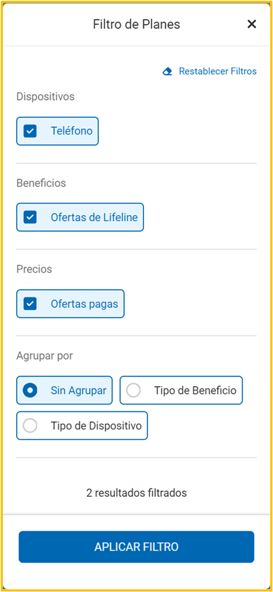 En la esquina superior derecha, se pueden Filtrar los planes de acuerdo con las necesidades del aplicante. Los agentes de ST podrán ordenar la información por Dispositivos, Beneficios, Precios y opciones de agrupación.