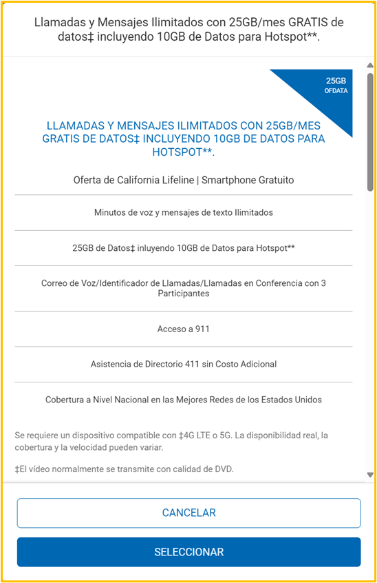 Disponibilidad de la Etiqueta: Cuando se llegue al paso de selección del Plan, los Agentes de ST pueden presentar las Etiquetas FCC para que los aplicantes puedan estar informados sobre todas las características disponibles.