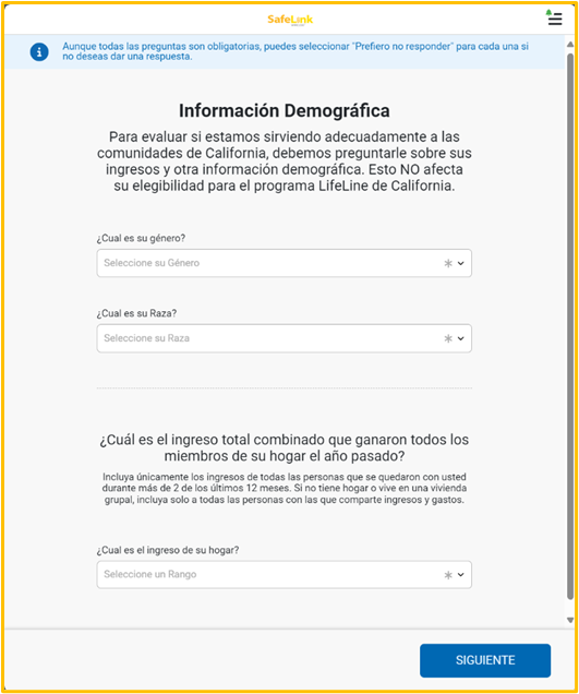 Como muestra la imagen anterior, los Agentes de ST deberán explicar a los aplicantes que el siguiente cuestionario ayudará a recopilar información sobre ingresos y demografía, lo cual no afectará su elegibilidad. Los aplicantes también podrán seleccionar la opción "Prefiero no responder" si no desean proporcionar una respuesta específica.