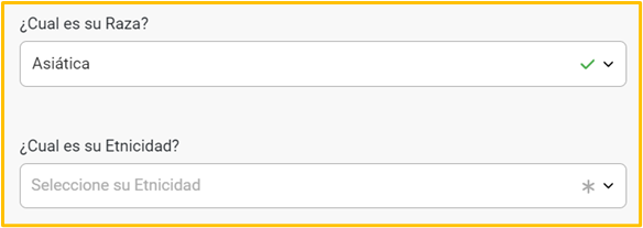 Para la primera pregunta (¿Cuál es su género?), los aplicantes podrán seleccionar entre las siguientes opciones: Masculino, Femenino, Transgénero, No binario/No conforme, Prefiero no responder. En el segundo paso, se les preguntará sobre su raza y etnia. Como se muestra a continuación, una vez que se seleccione la raza, el menú desplegable de Etnia estará disponible para seleccionar una opción de las disponibles.
