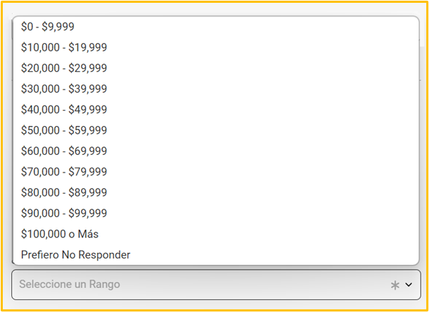 En el tercer paso, los Agentes de ST deberán seleccionar una de las opciones proporcionadas en la lista, según los ingresos anuales combinados que los aplicantes reciban en su hogar.
