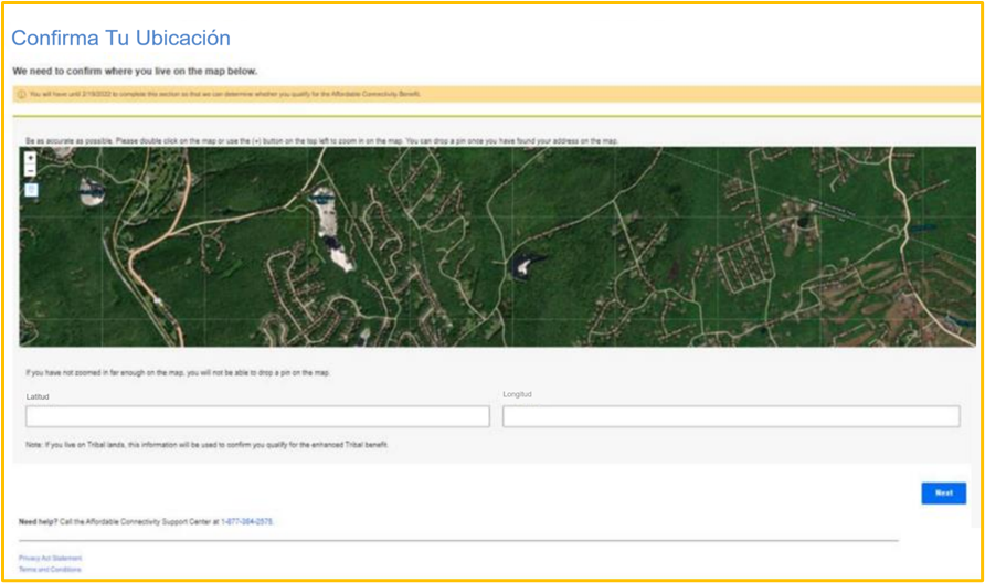 Si no se pudo verificar la dirección del aplicante, la ubicación de su dirección deberá ser confirmada al señalarla en el mapa. Una vez que se haga clic en la ubicación, los cuadros de Latitud y Longitud se llenarán automáticamente.