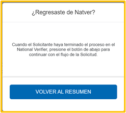 Una vez que se hayan cubierto todos los pasos en el sitio web de NatVer, el botón VOLVER AL RESUMEN estará disponible en la Quest app para regresar a esa sección.
