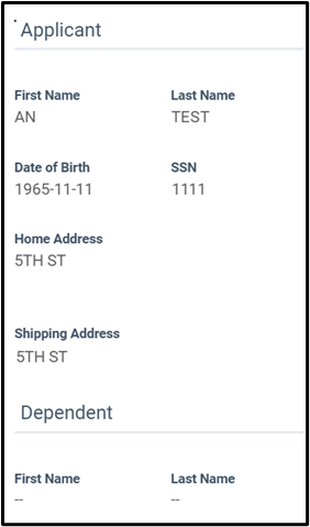 9) Applicants and Dependent's info: Here, we will find the applicant's PII. As you can see below, the system will show the information that we consider as risk factors. A shipping address will also be displayed, in case there is one available. The same will happen with the dependent's PII, if any: