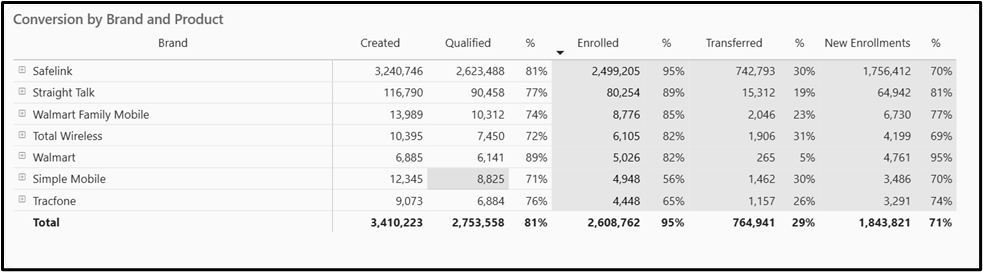 At the top of the screen, we will find the Conversion by Brand and Product. The first column shows the name of the Brand, then the number of Created enrollments will be available followed by the number of Qualified and Enrolled applications. Apart from the number of enrollments, there will be a % column showing the same result translated to percentages. Finally, there will be two columns showing the number of Transferred enrollments in contraposition to the New Enrollments column.