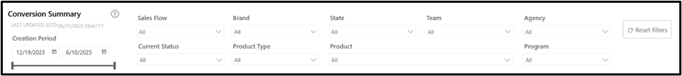 Users can filter the report by various criteria, including Sales Flow, Brand, State, Team, and others. Additionally, a Creation Period filter is available to define the desired date range for the search. Users will also find the Reset filters button on the right side of the screen, allowing users to clear all filters and restore the default settings.
