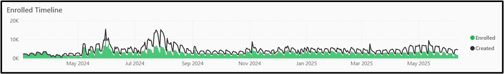 The Enrolled Timeline shows the number of enrollments created in green compared to the number of enrollments created (shown with a black line).