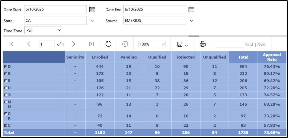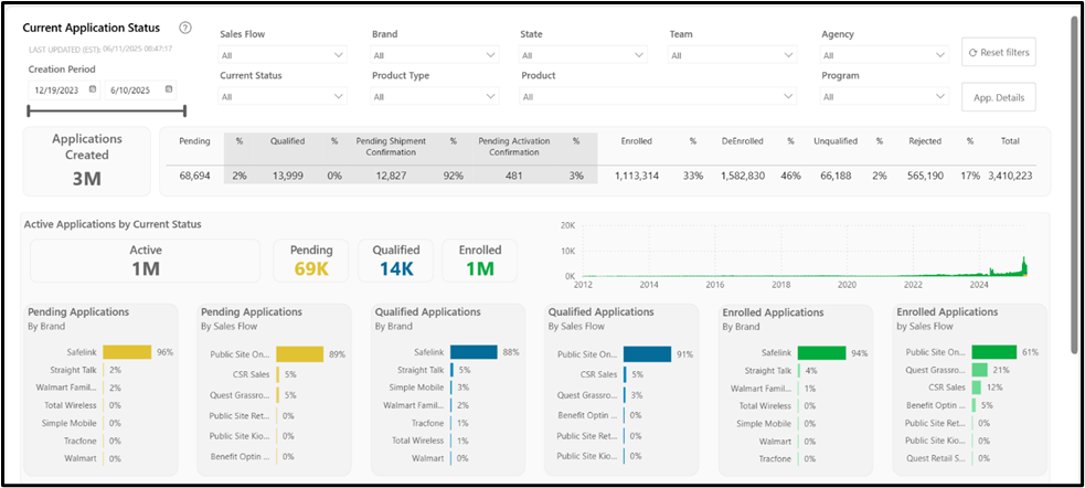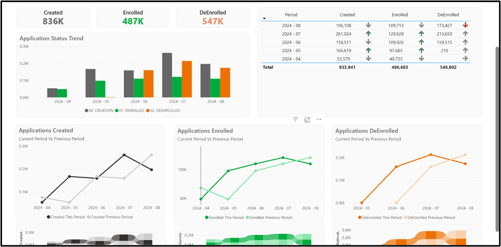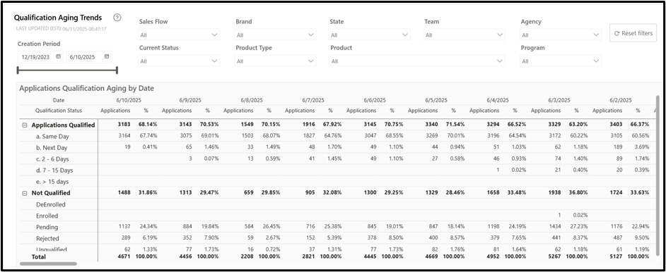 The Not Qualified section will be divided into DeEnrolled, Enrolled, Pending, Rejected, and Unqualified. In both sections, the information will be displayed daily, showing the number of applications and the percentage that they represent of the total.
