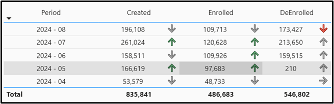 In this section, we will have the information of the enrollments created and DeEnrolled within a period of time. You will be able to see a graphic showing the number of enrollments created (in grey), the number of enrolled applications (in green) and the number of accounts DeEnrolled (in orange).