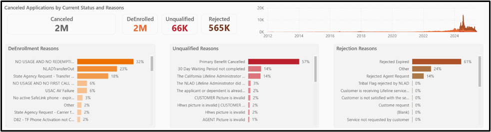 By scrolling down, users will see the information of Canceled Applications by Current Status and Reasons. There will be a list of the applications DeEnrolled, the Unqualified, and the Rejection Reasons.