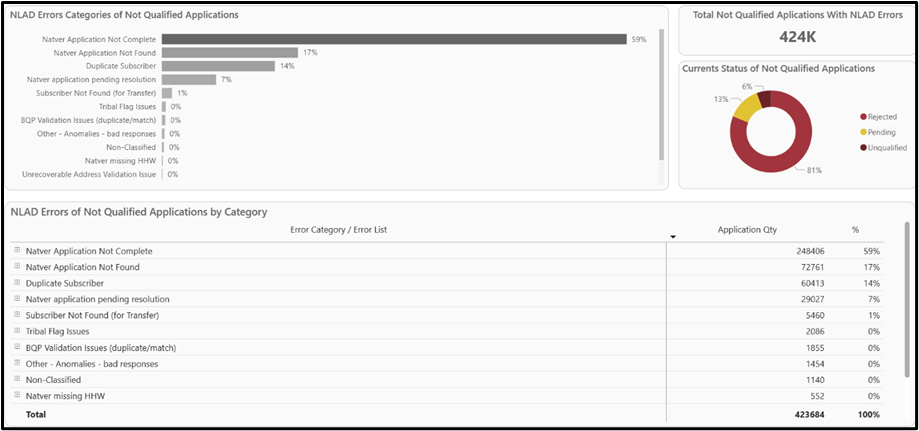 At the bottom, there will be an additional table titled 'NLAD Errors – Not Qualified by Category,' which lists the most common reasons why an enrollment could not be validated by NLAD. As usual, apart from the name of the validation issue, we will find the number of applications involved and their respective percentage.