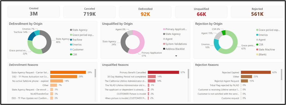 Users will also have access to the data related to NLAD and the validations involved. At the top, we will find the list showing the percentage of errors depending on the type of issue (Application Incomplete, Application not Found, etc.) There will also be a pie chart showing the number of enrollments Rejected, Pending, and Unqualified.