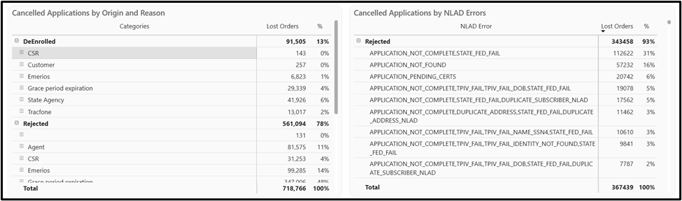 The list on the right shows the number of lost orders divided by the error reason provided by NLAD.