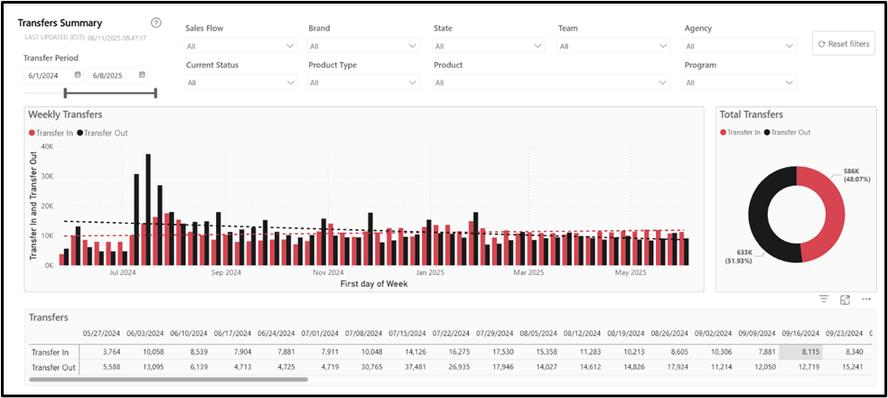 This section displays the number of transfers for a selected period. The data is divided into two categories: Transfers In (clients transferred from another provider to ours) and Transfers Out (clients transferred from our provider to another one).