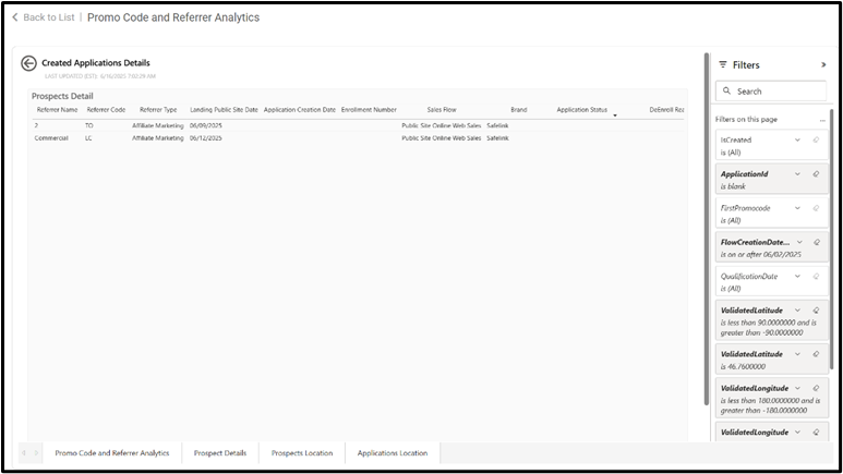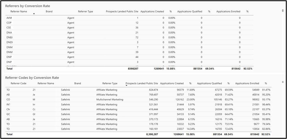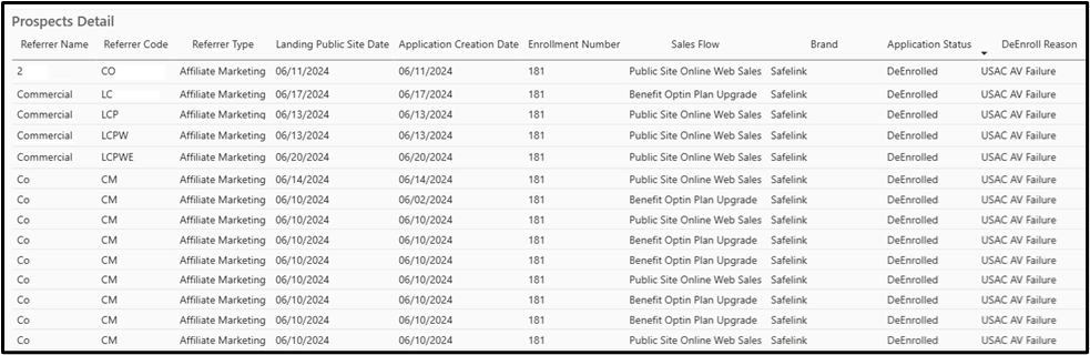 In this tab, users will be able to get more detailed information from Referrers, such as their NAME, the CODE, and TYPE. We will also see the dates for the Landing Public Site, the Application Creation, along with the Enrollment Number, the Sales Flow and Brand. Finally, the Application Status will be presented with the DeEnroll Reason.