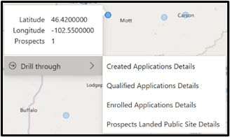 By clicking on any of the locations, a pop-up will show the location details and will also have the Drill through option, in case users are interested in getting specific information about the application details.