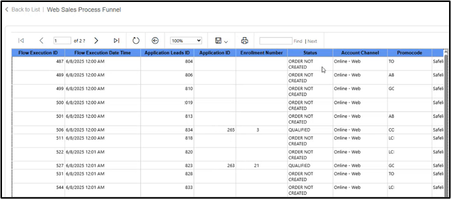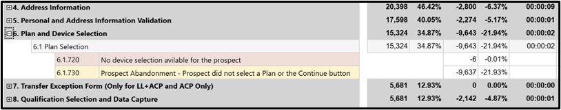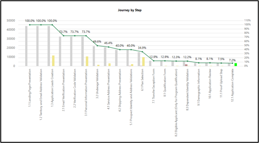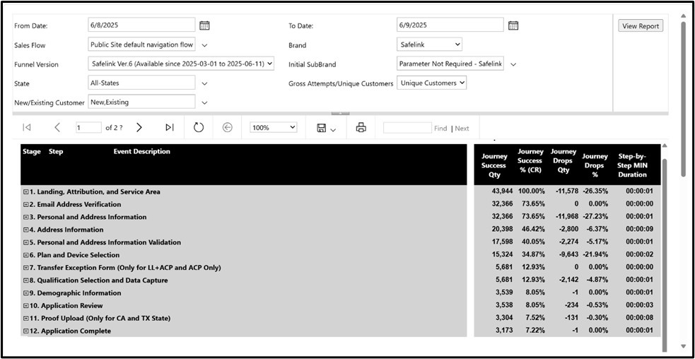 These two reports display the application creation funnel for enrollments submitted through the SafeLink Website and Quest channels. They allow us to identify the specific step where each enrollment process stopped or was not completed.