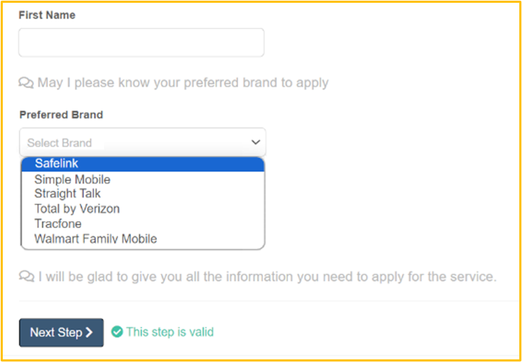 As the image below shows, once the applicant’s zip code is introduced, the system will request their first name along with the Preferred Brand, from which they will have to select one to continue to the next step:
