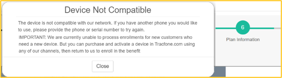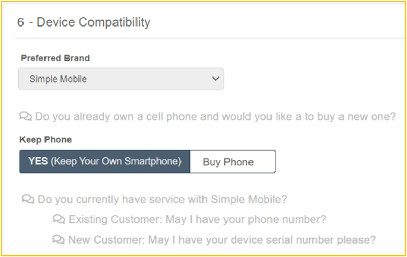 Once in the Device Compatibility section, the system will show the Preferred Brand that the customer selected along with the different service options available depending on the applicant’s location and brand.