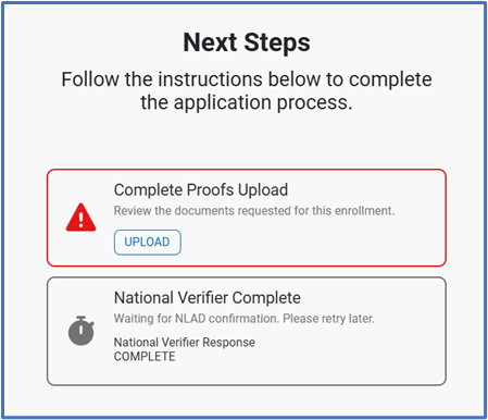 The California Thank You page has a combined new design that allows users to review next steps, as well as the information for both federal and state benefits, when the plan selected is Federal + State. As the image below shows, since applicants selected at least one federal benefit, they will be requested to complete the validation process in the NatVer website, if applicable, apart from uploading pending proofs, if any.