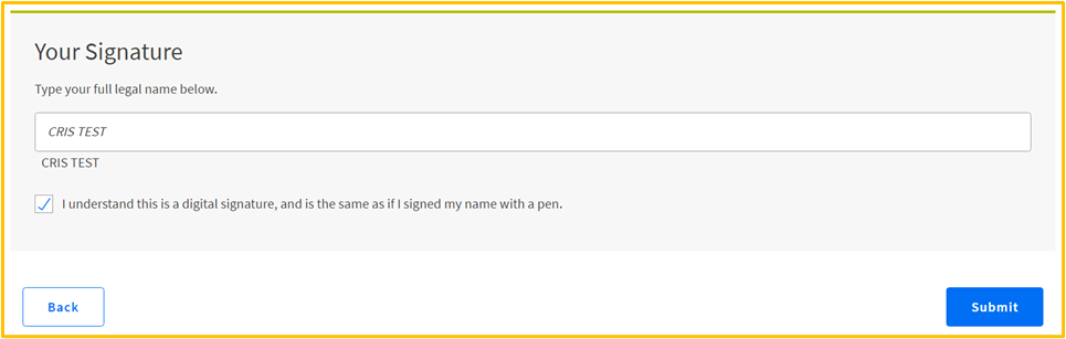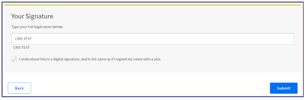 At the bottom, there will be a section to provide the electronic signature. Applicants will have to type their full name and check on the box provided.