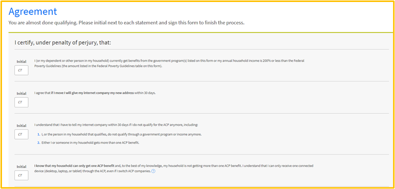 Applicants may need to go through the Agreement section and provide their initials in each term and condition and then provide their full name to continue.
