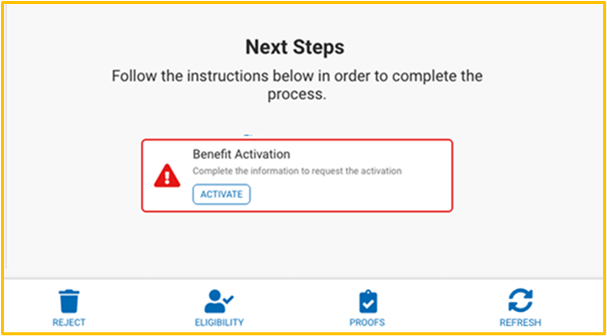 After all the necessary proofs have and requirements have been approved, the Benefit Activation button will become available. To continue with the activation process, the ACTIVATE button should be pressed.
