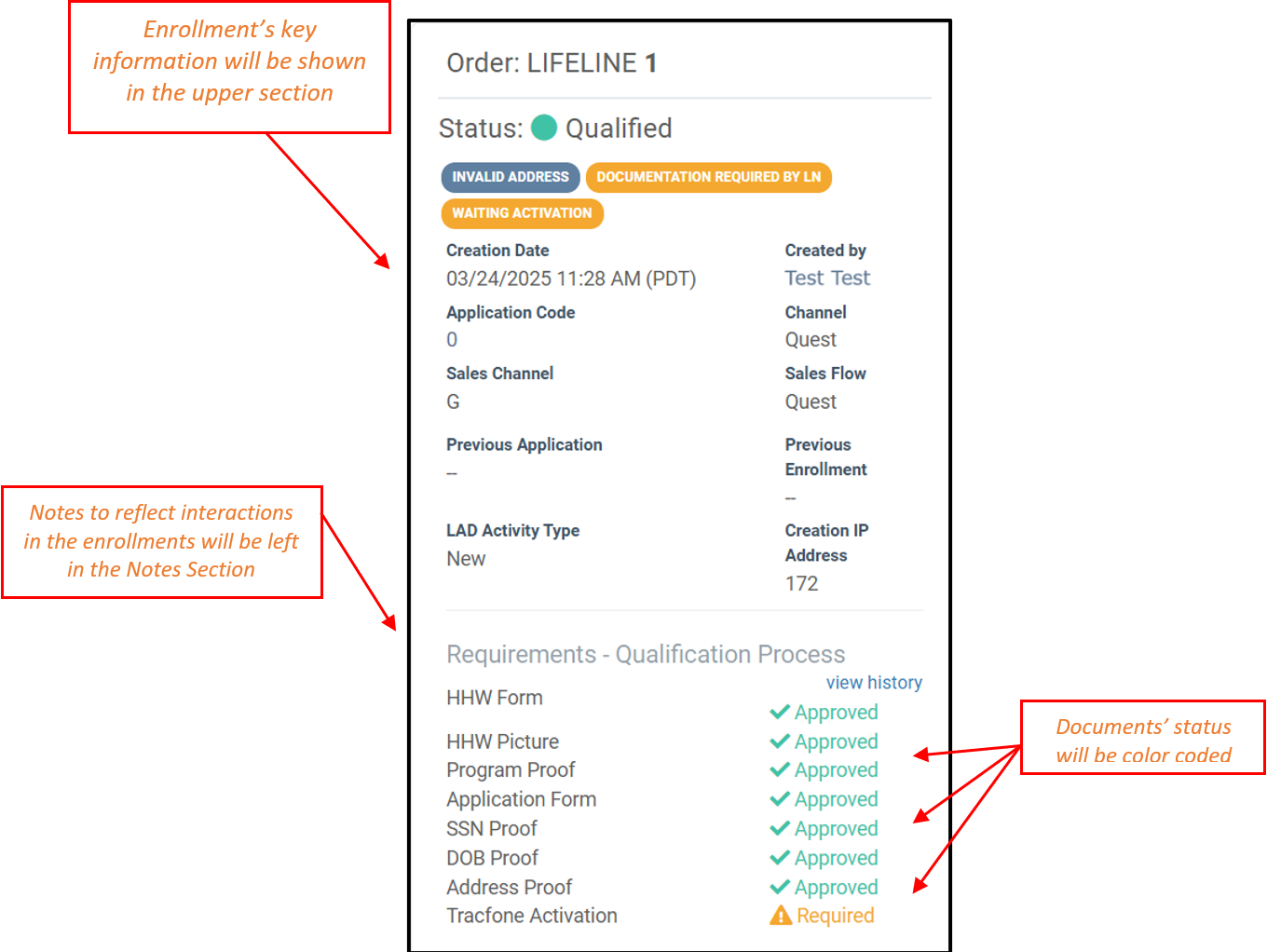 1) Enrollment Information: This section includes the enrollment’s main information such as: enrollment status, creation date, creation channel and Documentation required status.