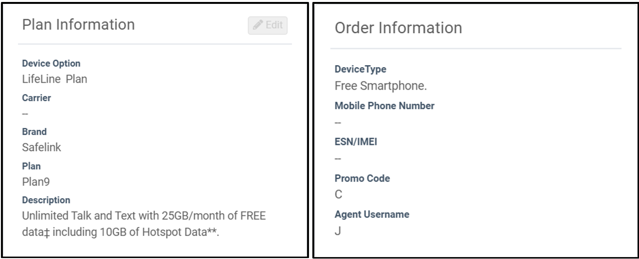 By scrolling down, the Plan Information selected will be shown, along with the Order Information.