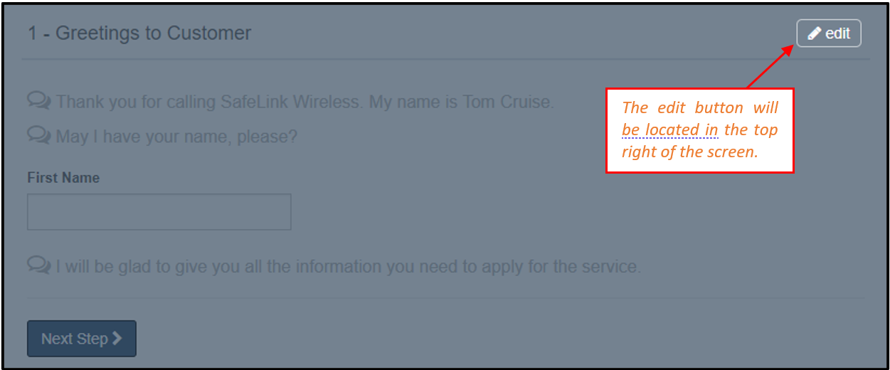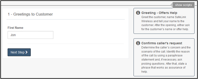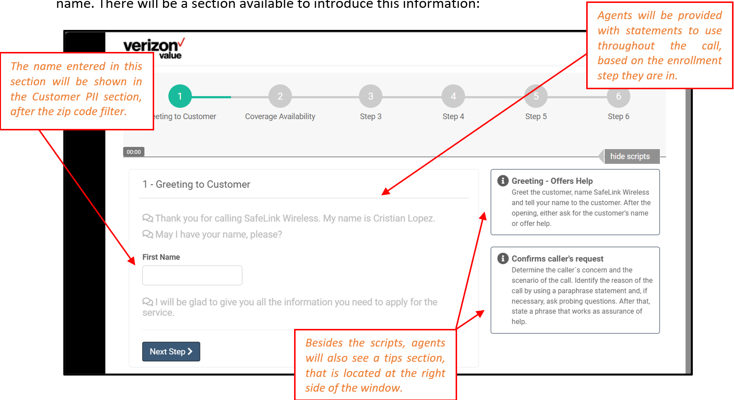 In the first step, agents will be provided with statements to open the call and request the applicant’s first name. There will be a section available to introduce this information: