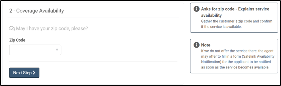 If the zip code provided belongs to an area where there is service available, the next step will be for the agent to present the first requirement making sure that the applicant receives any of the listed participation programs that will be shown next.
