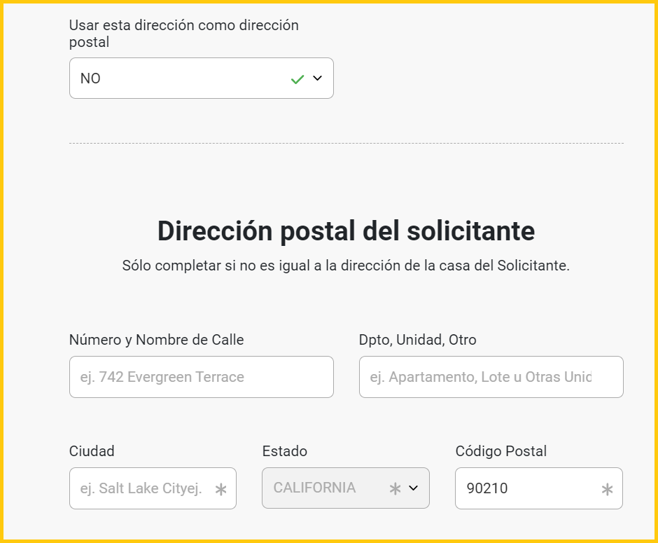 La sección de Dirección de envío se tendrá que llenar obligatoriamente y el solicitante tendrá que proveer una dirección válida para poder continuar con el proceso: