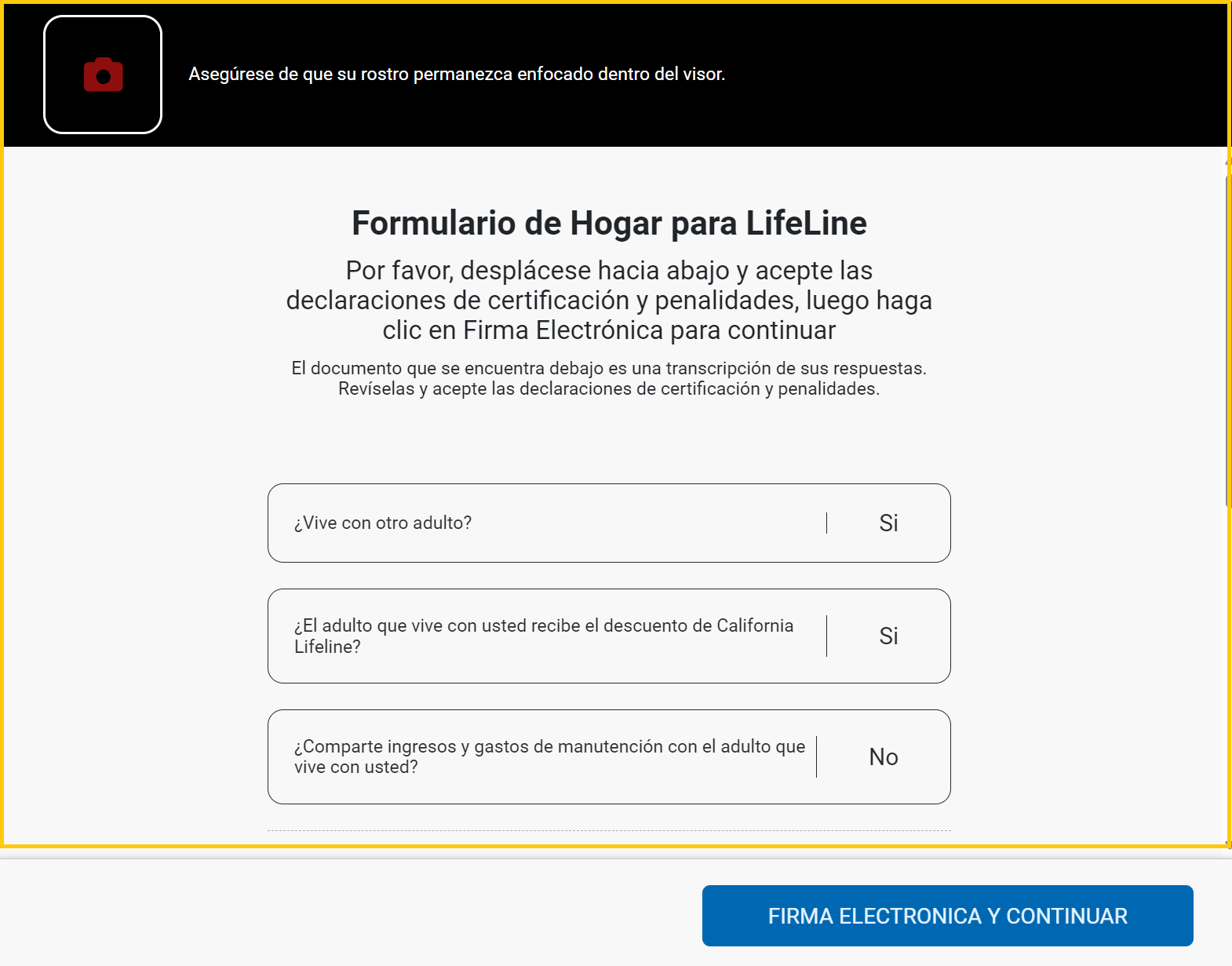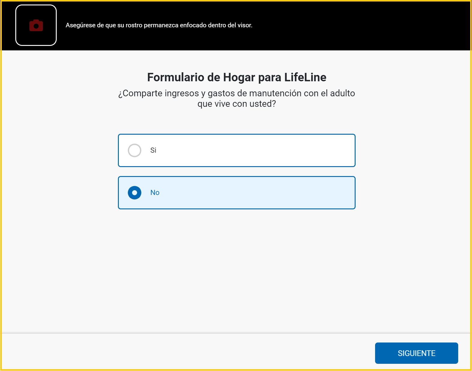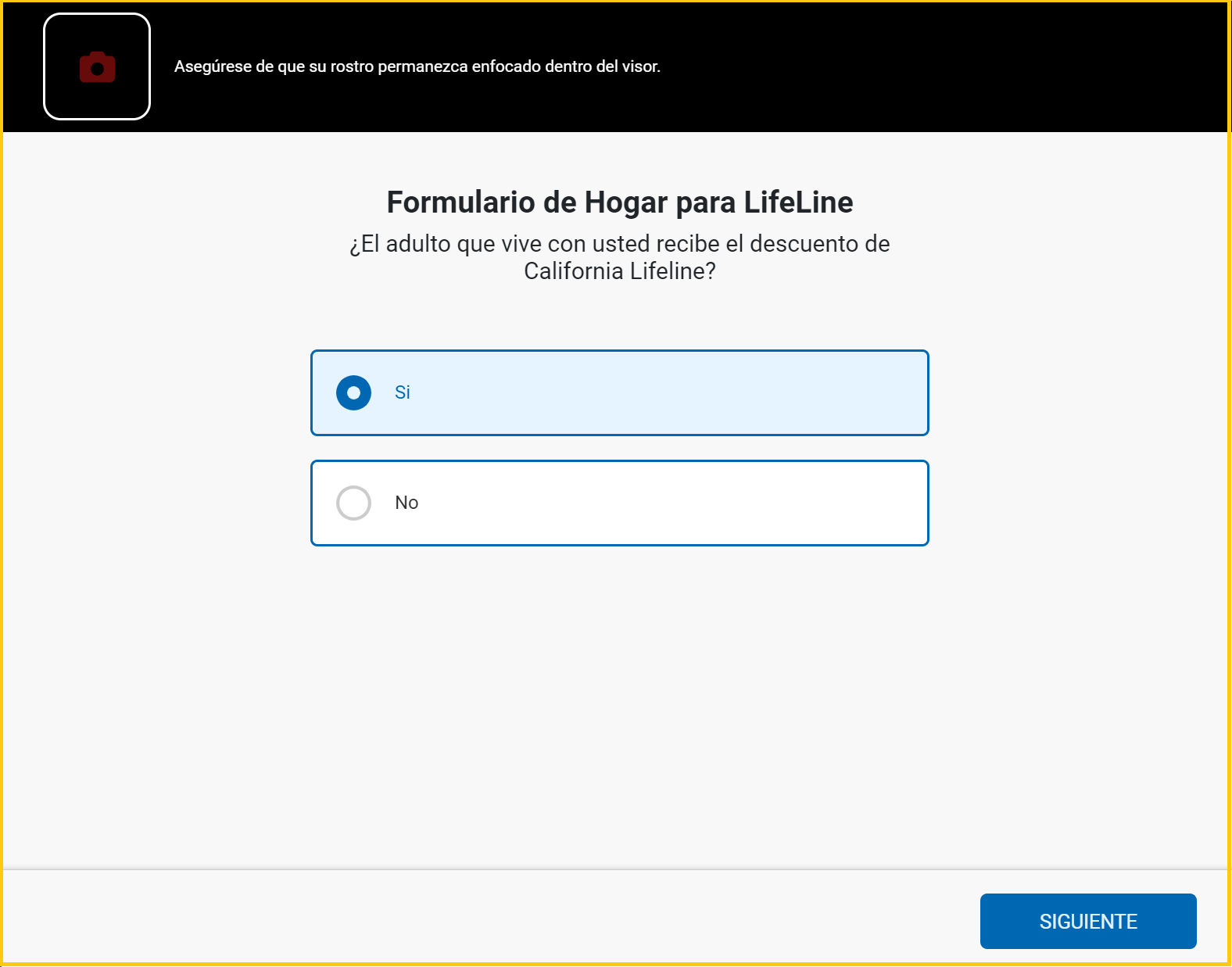 Si la respuesta a la primera pregunta es Sí, se mostrará la segunda pregunta, donde los solicitantes deberán indicar si esa persona recibe un descuento de Lifeline. Si la respuesta es No, el proceso finalizará.