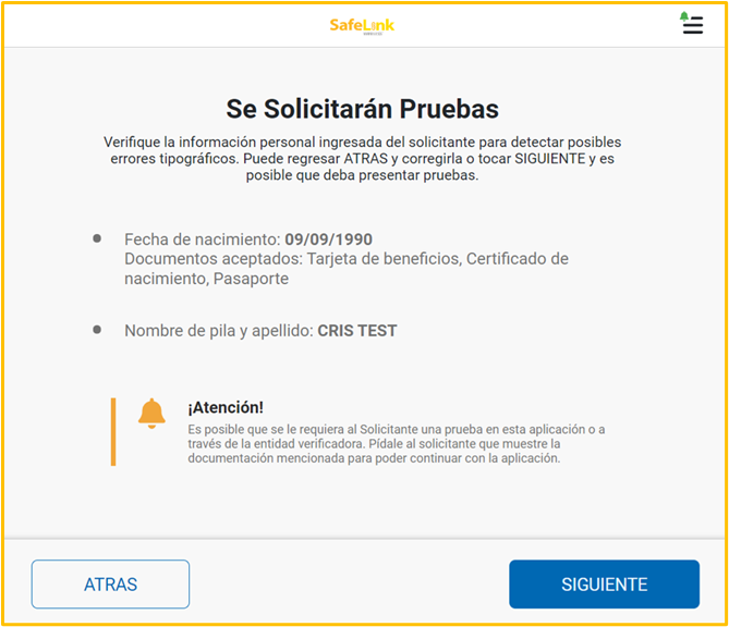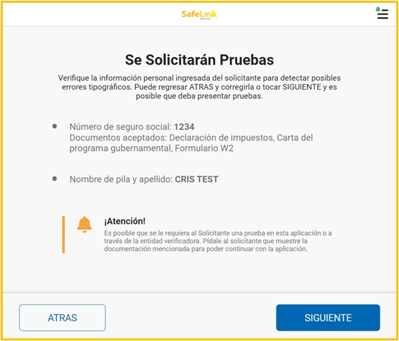 El agente tendrá tres intentos para modificar la información introducida. Si la información es inválida, un mensaje informará que, para continuar con el proceso, el cliente deberá enviar una prueba de SSN. Si el cliente acepta, el agente tocará el botón SIGUIENTE: