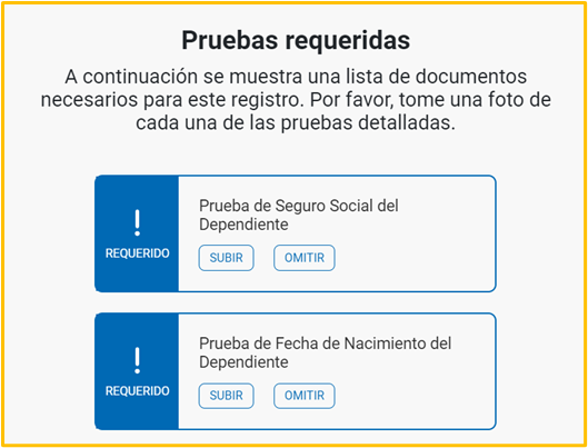 Como puede verse, se necesitan tanto la prueba de SSN como la de fecha de nacimiento. El procedimiento a seguir es el mismo que se usa en las aplicaciones sin dependiente, al igual que los tipos de prueba que pueden enviarse.