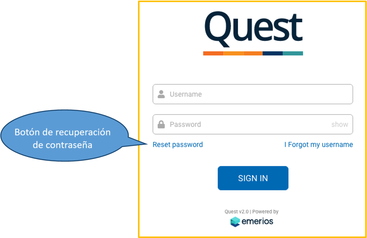 Al utilizar la Quest App, los agentes podrán resetear su contraseña en la sección de logueo mediante la opción ubicada debajo del ingreso de contraseña. Es muy importante que recuerden la dirección de email con la que se creó el usuario, ya que en cualquier otra interacción relacionada con la contraseña, se utilizará la misma casilla para reenviar la información del agente de manera segura.