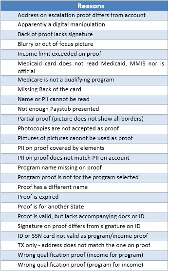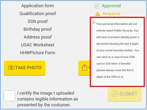 In the case from above, we can see that the Application form and the USAC Worksheet were approved, and the applicant also submitted Qualification, SSN and DOB proofs, but they were rejected. In order to determine the rejection reason, the agent will have to scroll down and will see all the reasons why the documents were deemed invalid: