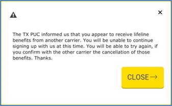 It may happen that while creating an application for an applicant who resides in Texas, the system informs that they are already receiving a Lifeline benefit. When this happens, the Street Team Agent has to inform the applicant that the account cannot be created, unless they confirm with the other service provider the cancellation of those benefits: